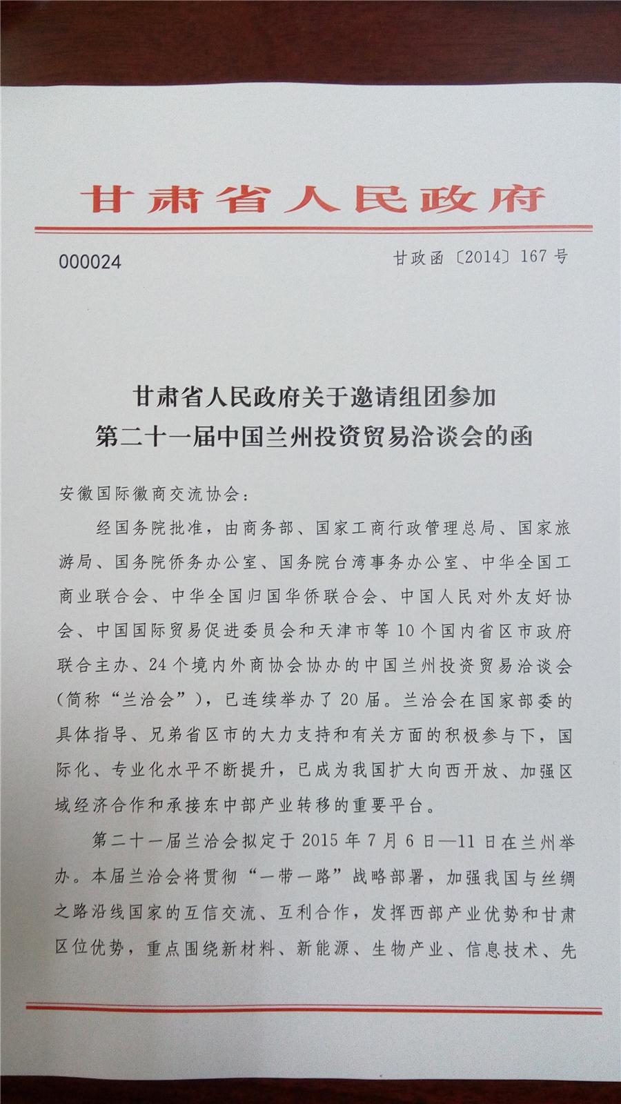 关于邀请参加“徽商陇上行”的函附件